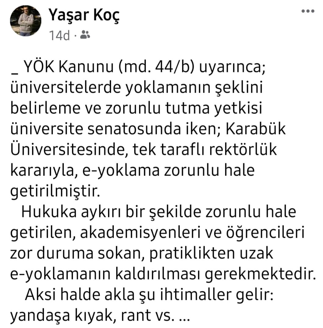Öte yandan Karabük’ün tanınmış Avukatlarından Yaşar Koç’ta kendi sosyal medyasından konunun yanlışlığına değinerek ” YÖK Kanunu (md. 44/b) uyarınca; üniversitelerde yoklamanın şeklini belirleme ve zorunlu tutma yetkisi üniversite senatosunda iken; Karabük Üniversitesinde, tek taraflı rektörlük kararıyla, e-yoklama zorunlu hale getirilmiştir. Hukuka aykırı bir şekilde zorunlu hale getirilen, akademisyenleri ve öğrencileri zor duruma sokan, pratiklikten uzak e-yoklamanın kaldırılması gerekmektedir.” ifadelerine yer verdi