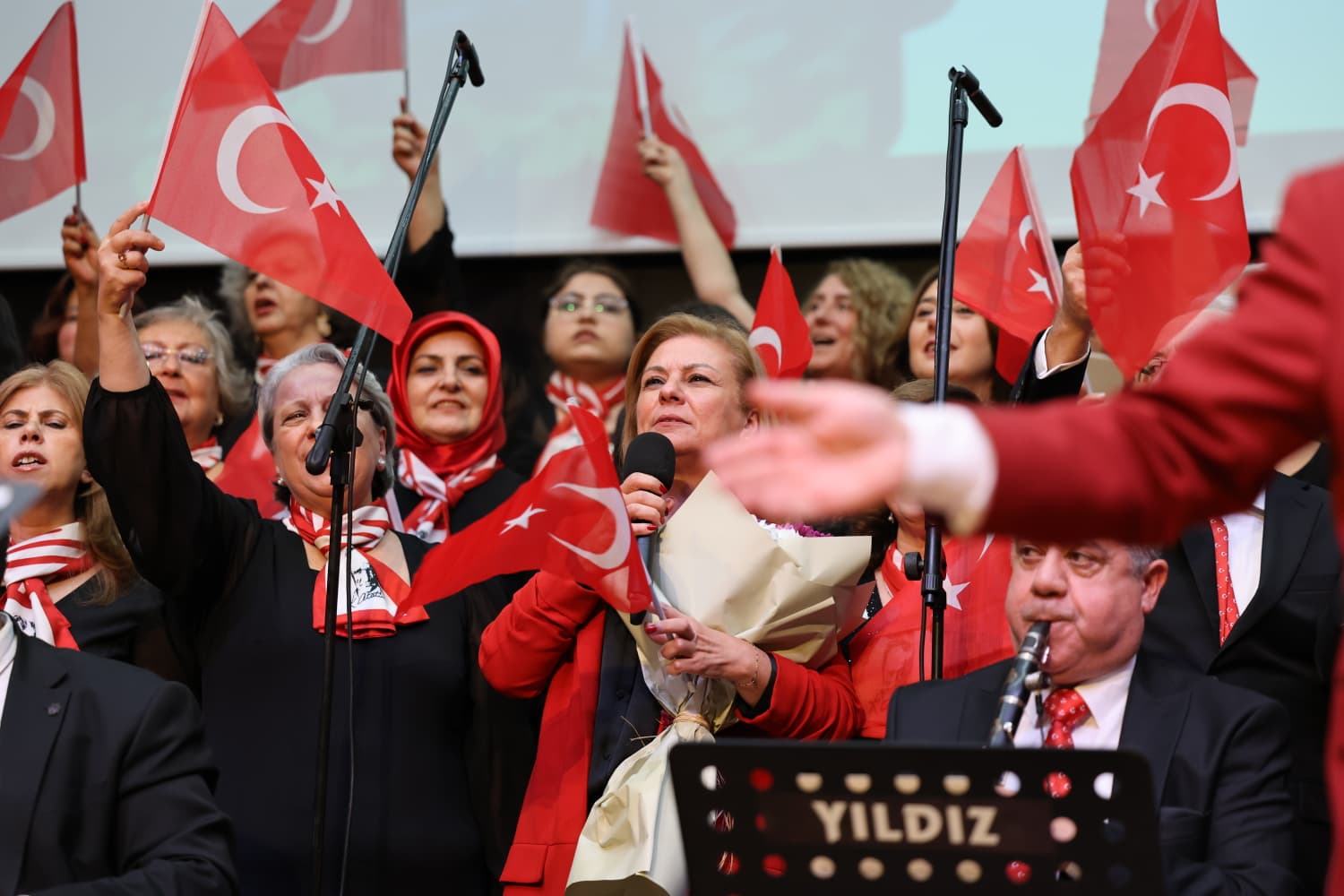 Konserin finalinde Safranbolu Belediye Başkanı Mimar Elif Köse, koro üyeleriyle birlikte İzmir Marşı’nı seslendirerek salondaki coşkuyu zirveye taşıdı.