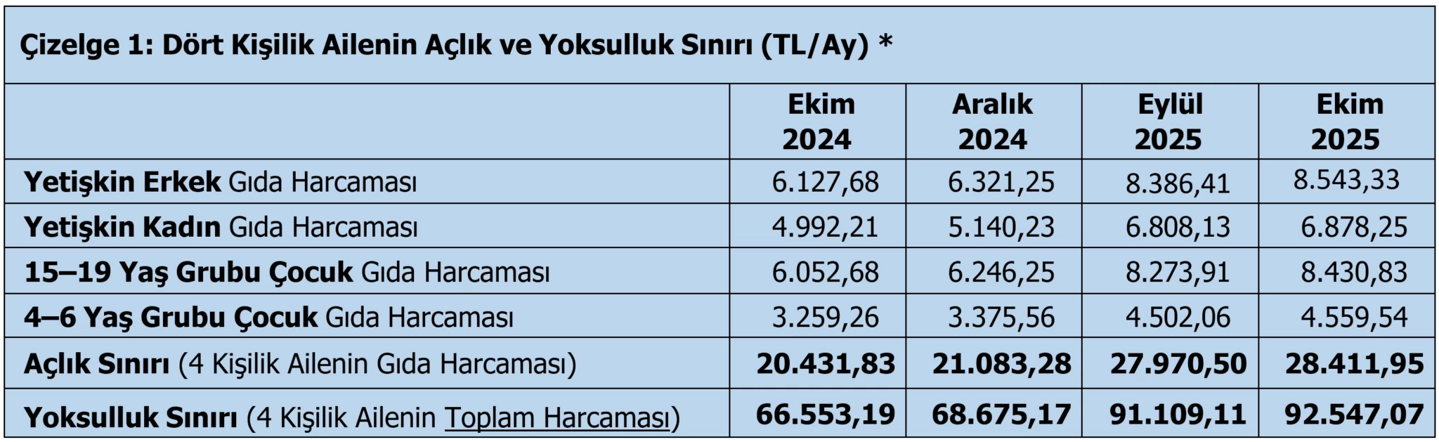 Türkiye İşçi Sendikaları Konfederasyonu (TÜRK-İŞ), Ekim 2025 ayına ilişkin “Açlık ve Yoksulluk Sınırı” araştırmasının sonuçlarını açıkladı. Araştırmaya göre, Ankara’da yaşayan dört kişilik bir ailenin sağlıklı, dengeli ve yeterli beslenebilmesi için yapması gereken aylık gıda harcaması (açlık sınırı) 28 bin 412 lira olarak belirlendi.